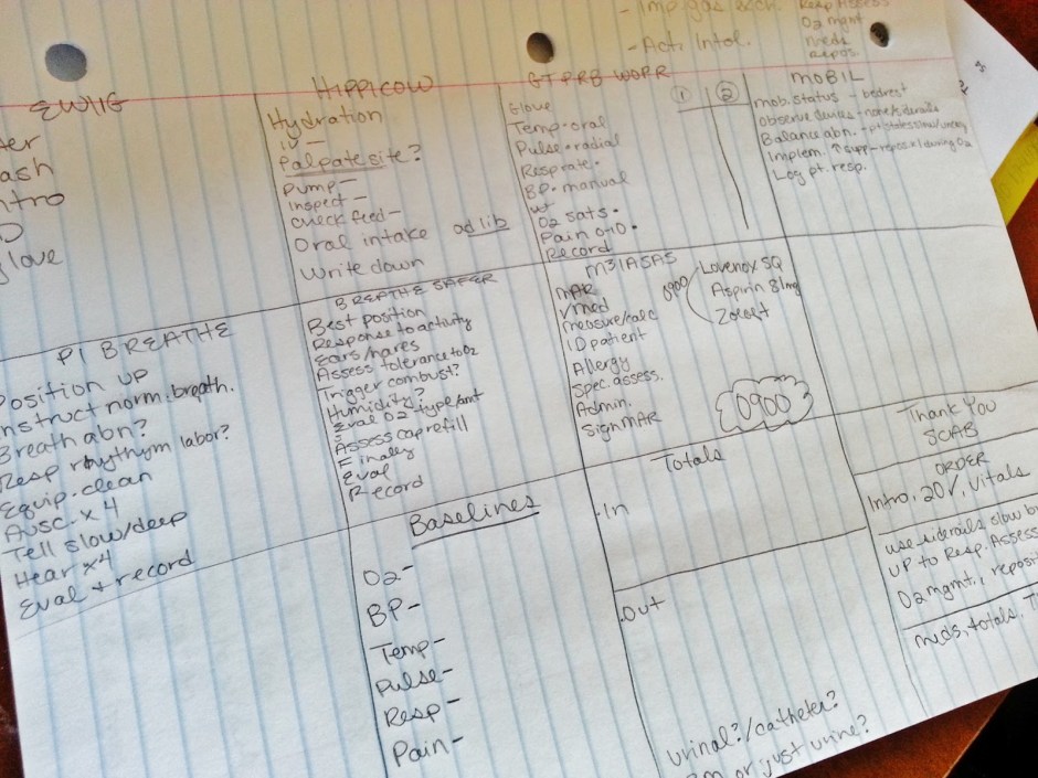 I have re-written all of my narrative notes and evaluations as best as I can remember. They may have flowed a bit less smoothly during the weekend, I’d add in a mnemonic that I forgot at the end sometimes and it didn’t sound perfect but it hit the important parts. I tended to overdocument a bit rather than just hit the required critical elements. I charted right from my mnemonics on the grid but worded things out of order occasionally so that they sounded better. I’ll be honest I didn’t write much down on my grids during implementation. Continue reading “CPNE Documentation and Narrative Notes”