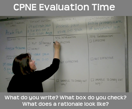 Moving on to the final part of documentation, your evaluation form with rationales. This is Sheri doing her thing and breaking down evals. Just thought I’d write out the ones that I used for my 3 PCS’s and then a couple of the ones I used for practice care plans for reference. The main thing I focused on in careplans was to ensure that my evaluation would be a piece of cake, I never picked a diagnostic label that would or could possibly set me up for a challenge at eval because I figured if you made it that far the last thing you want to do is mess up the eval!I made sure, as best as I could, that I’d be able to check that “effective” box when I selected my interventions, I wanted to avoid the ‘not effective’ and ‘unmet’ options like the plague. Continue reading “CPNE Evaluations and Rationales”