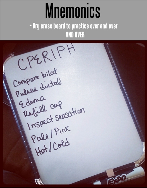 The only way in my mind to even come close to remembering all of your “critical elements” for each area of care assigned and THEN remember to document the appropriate elements is to use mnemonics. I have pretty much a photographic memory and even I wouldn’t have chanced the idea of forgetting one little thing either in implementation or documentation. You would want to rip your own head off if you got to the end and left off one tiny thing and failed the whole shabang…